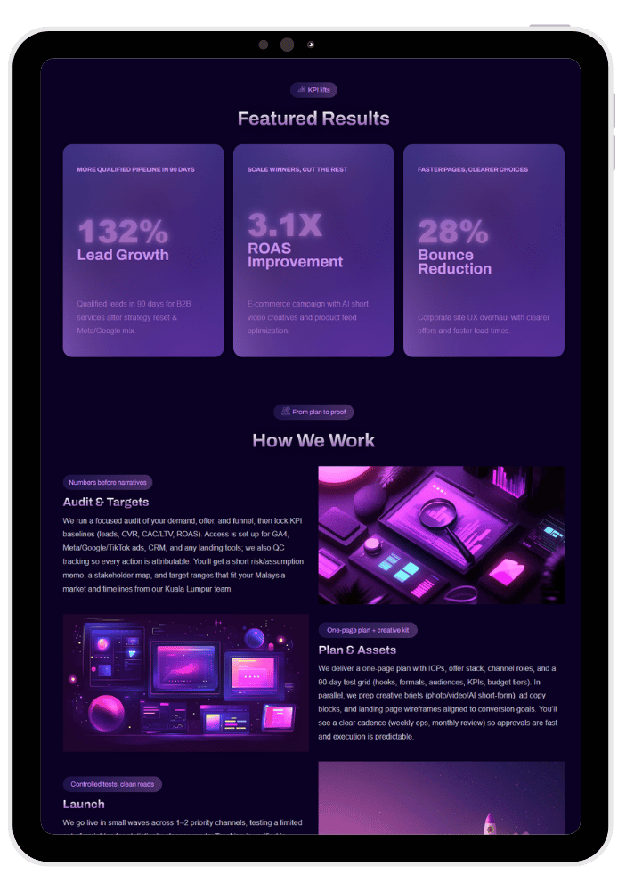 From concept to clicks. Senior-led UX, scalable design systems, and performance tracking—so every page drives value. Built in Kuala Lumpur, serving clients nationwide.